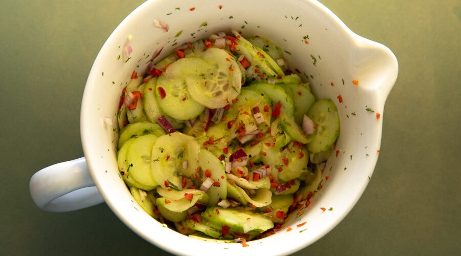 Den Großteil der Hagebutten habe ich zu Hagebuttenmus gekocht. Eine Hand voll fein gehackte rohe Hagebuttenschale warf ich spontan in einen Gurkensalat mit Dill. Als ungewohnte Zutat am klassischen Gurkensalat ist Hagebutte somit das X in Überschrift und Rezept. Die Hagebutte ist Farbtupfer, knackige Konsistenz und feinsäuerlicher Geschmack in einem. Zugegeben, man schmeckt die Hagebutte in dem eh schon sauren Essig-Fluidum nicht heraus. Dennoch hat mir diese knackig-frische herbstliche Gurkensalatvariante sehr gefallen.