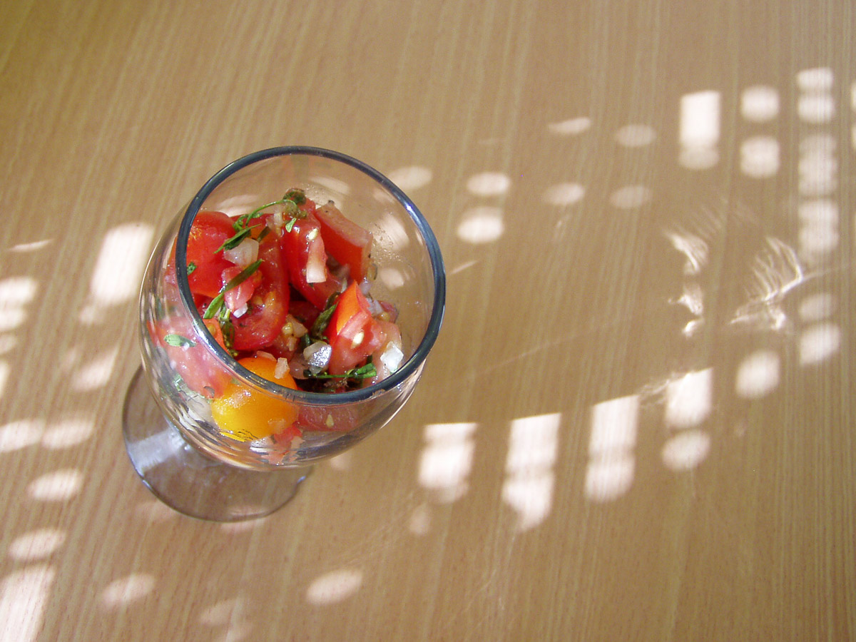 für 2 Personen5 sommerreife Tomaten ( ich: 4 plus eine Hand voll Minis aus eigener Ernte)